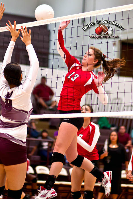 The Lady Rattlers looked like the number one team in the Valley Saturday afternoon. Mission is not a push-over, but Sharyland cruised to a three game win. Outside hitter Laura Eberly goes up for one of her many kills for the afternoon.